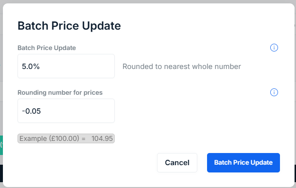 - Batch Price Updates: You can now apply a percentage increase (e.g., +5%) across hundreds or thousands of maintenance plans instantly. No more manual data entry; just protected margins. You can even set the rounding you want so you don't get awkward prices like £79.17. Choose to round to the nearest whole pound or down by, for example, 5p (£90 or £89.95 if you prefer being under a price band).